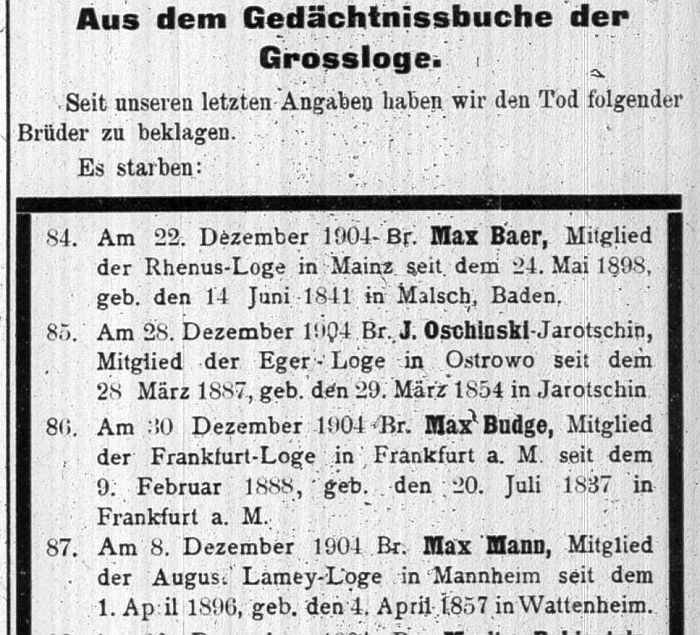 der "Großloge Deutschland" vom Januar 1905 S. 11: "Aus dem