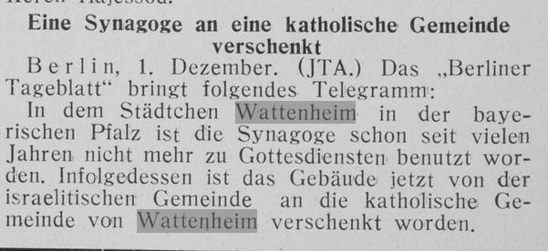 Jahrzehnt die Synagoge in Wattenheim der dortigen katholischen