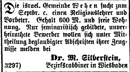 1885). Die Gemeinde gehörte zum Rabbinatsbezirk in Wiesbaden.