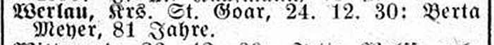 Geburtstag: "Werlau, Kreis St. Goae, 24. Dezember 1930: Berta Meyer, 81