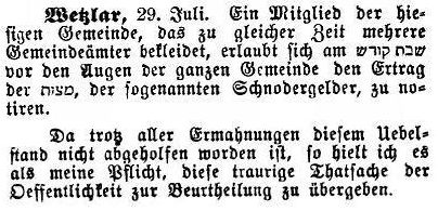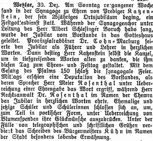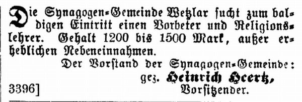 um 1915 wurde Wetzlar mit den Gemeinden des Kreises dem Provinzialrabbinat in