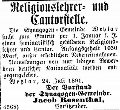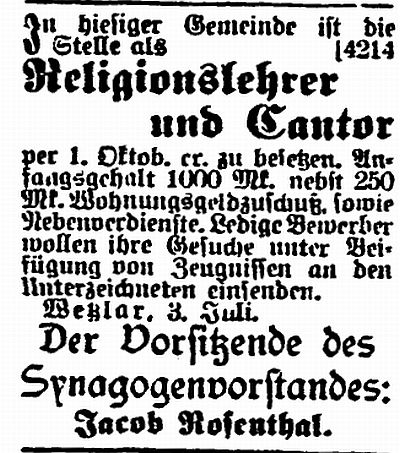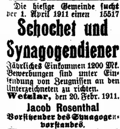 als Vorbeter und Schochet tätig war (siehe Ausschreibungen der Stelle unten);