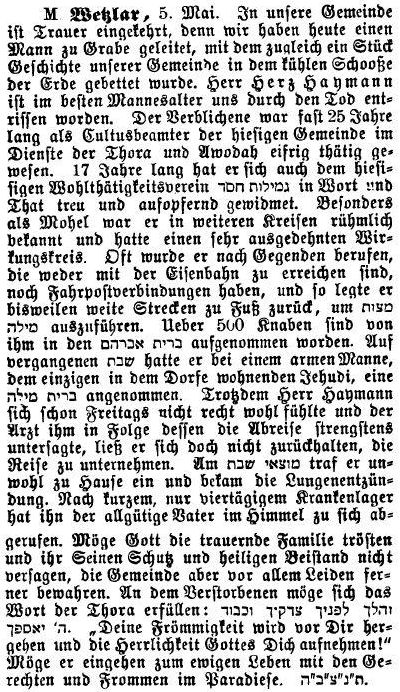 werden insbesondere genannt: 1851 bis 1876 Herz Heymann, ca. 1878 bis ca.