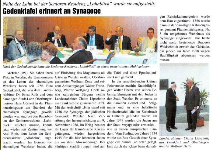 Dezember 2013: "Stadt sucht Paten für "Stolpersteine". 22 neue Erinnerungen geplant Wetzlar. Sechs so genannte Stolpersteine erinnern schon jetzt an das Schicksal von Wetzlarer Juden im Dritten Reich. Jetzt sollen weitere Gedenksteine hinzukommen.