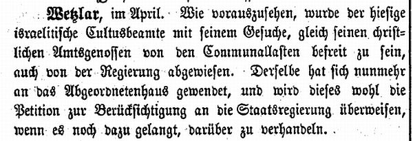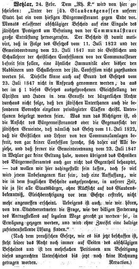 Rabbinat Friedberg. 1838 gehörte Wetzlar zum Konsistorium in Bonn. Spätestens