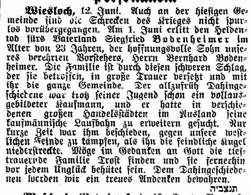 Außerdem ist gefallen: Siegfried Bodenheimer (geb. 5.1.1892 in Wiesloch, vor