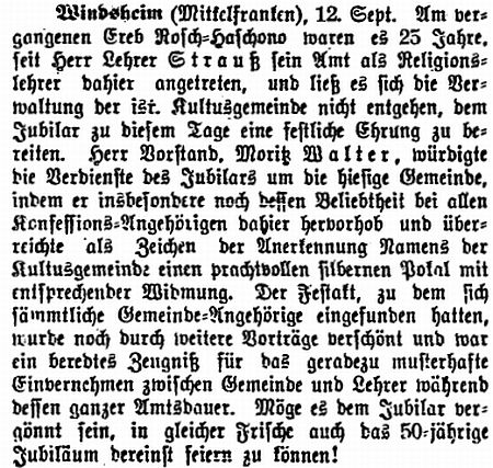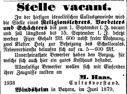 Ausschreibung im Juli 1879 als Lehrer in Bad Windsheim genannt wird ("Der