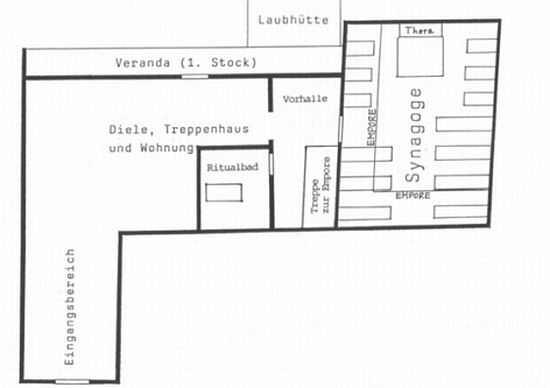 Wohnhaus mit Schulräumen und ein 1888 erbautes rituelles Bad (Mikwe; Lage südlich