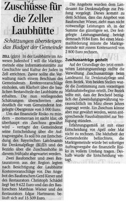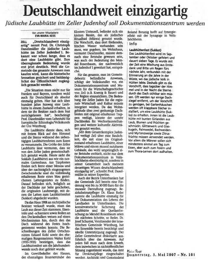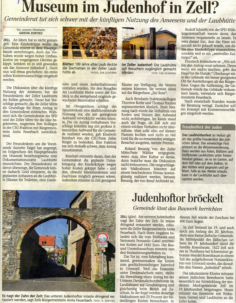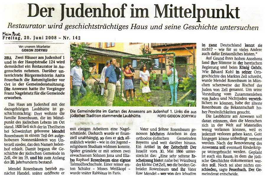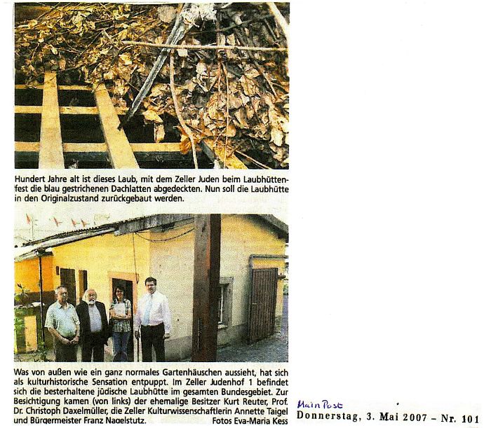 Die Laubhütte der Familie des Mendel Rosenbaum (1783-1868) befindet sich seit 2008 im Besitz der Marktgemeinde Zell a. Main. Sie wird im weiteren Verlauf der Altortsanierung unserer Nachbargemeinde museal gestaltet und öffentlich zugänglich gemacht werden. Die Planungen laufen.