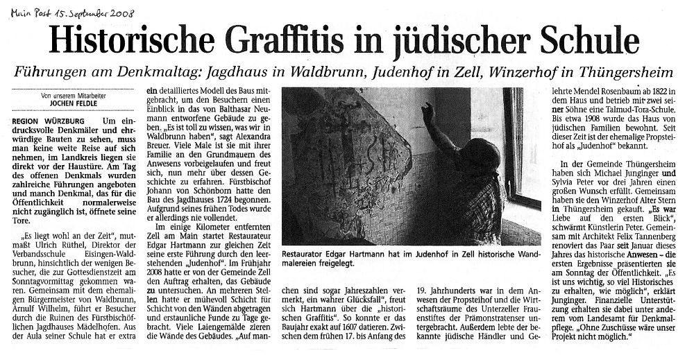 'Judenhof' geboten. Beeindruckende Fotos (Katrin Heyer, Veitshöchheim) und informative Texte (Annette Taigel, Zell a. Main, Graphik: Ulli Hantke) beleuchten die Rosenbaumsche Laubhütte als herausragendes Kulturdenkmal.