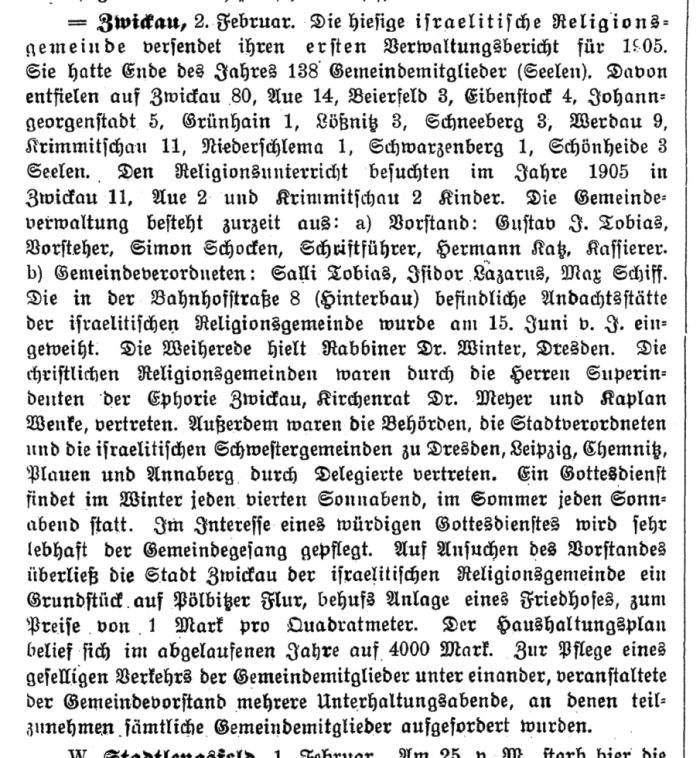 im "Israelitischen Familienblatt" vom 29. Juni 1905: "Zwickau (Jüdischer