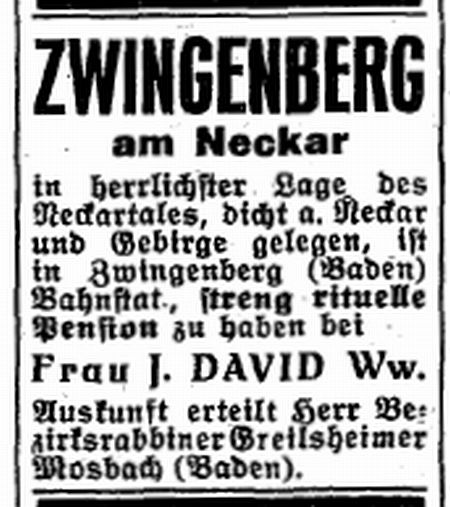 Zwingenberg. Von ihnen verzog Josef David nach Frankfurt, Rebekka David nach