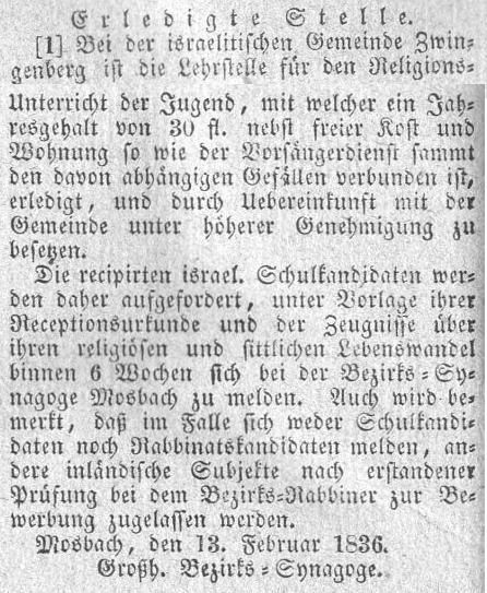 israelitischen Gemeinde Zwingenberg ist die Lehrstelle für den Religionsunterricht