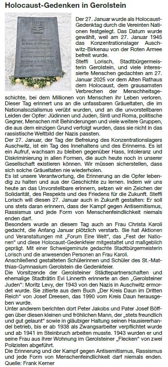 Artikel "Holocaust-Gedenken in Gerolstein" in der Ausgabe 7/2025 der
