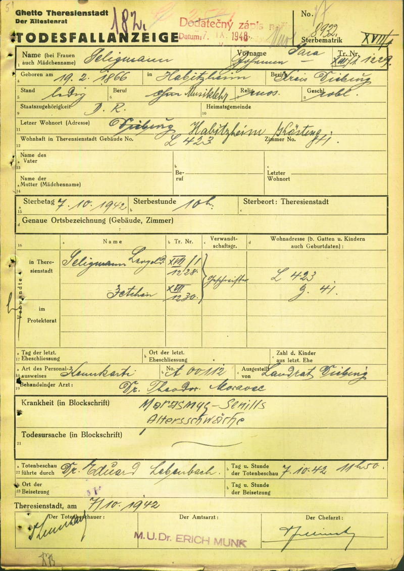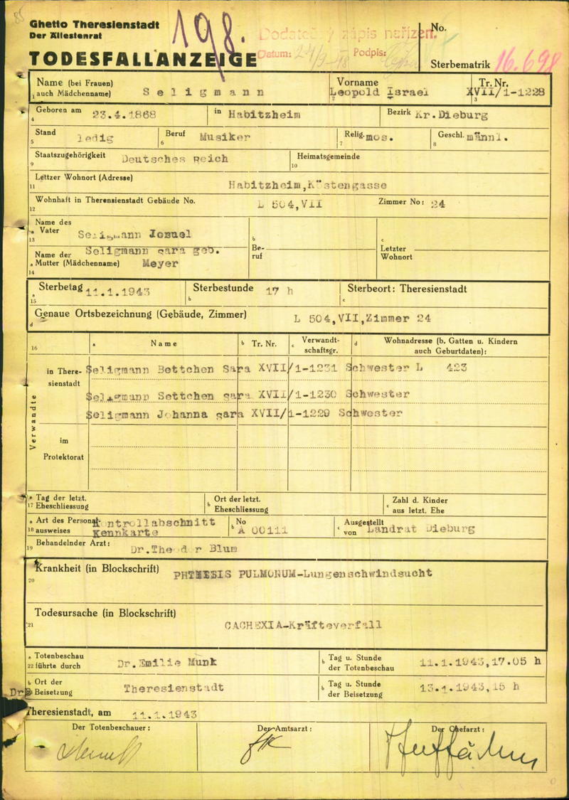 Todesfallanzeigen zu Personen, die im Ghetto Theresienstadt