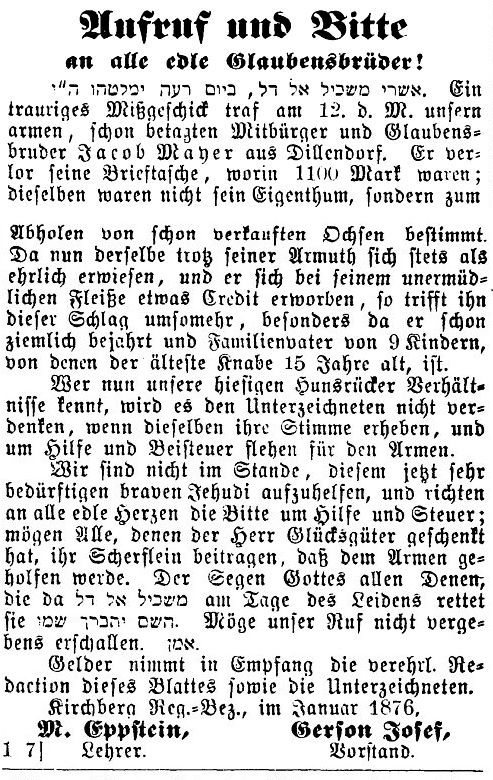 Schule); von 1867 bis 1876/83 Lehrer Moses Mayer gen. Eppstein, der nach