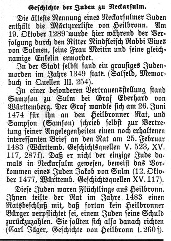 dem Deutschen Orden gehörenden Neckarsulm bestand eine jüdische Gemeinde im Mittelalter, die durch die Judenverfolgungen 1298 und 1349 vernichtet wurde. In