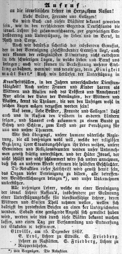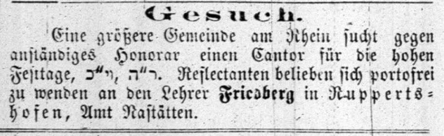Ausschreibungen der Stelle unten). Um 1863/69 wird Lehrer S. Friedberg in