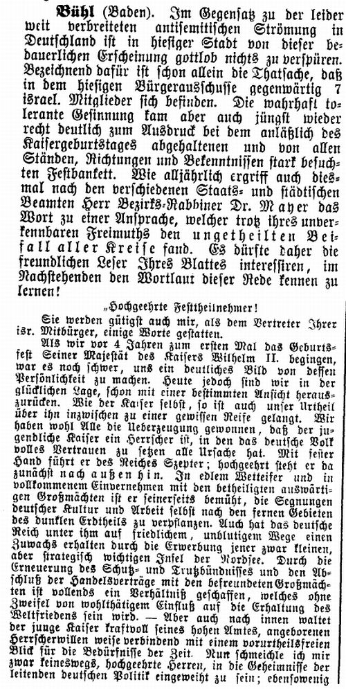 1885 bis 1925 Bezirksrabbiner in Bühl, erfreute sich allgemeiner Beliebtheit,