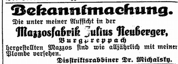 ehemaligen Mazzenbäckerei Neuberger (Hauptstraße 12; vgl. Anzeigen oben).