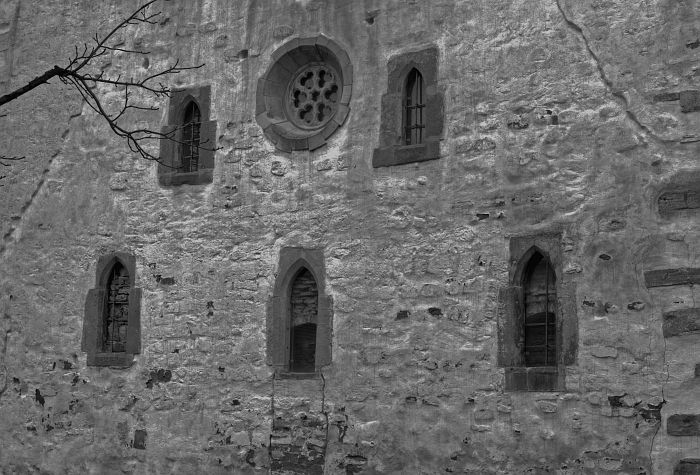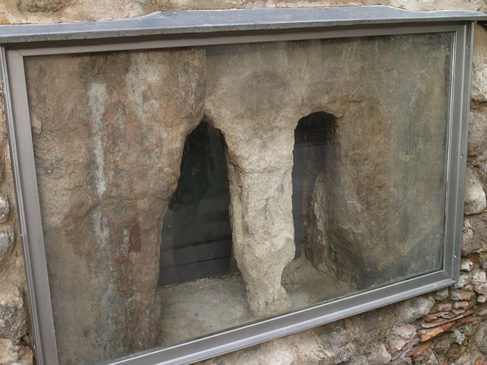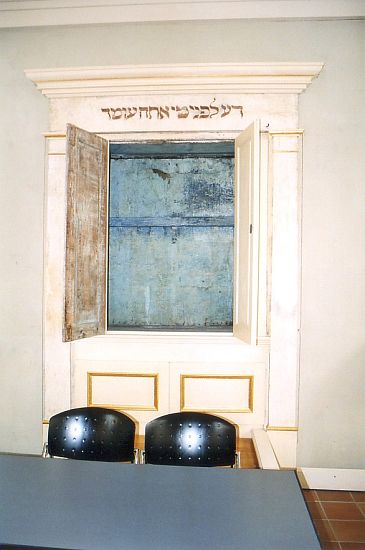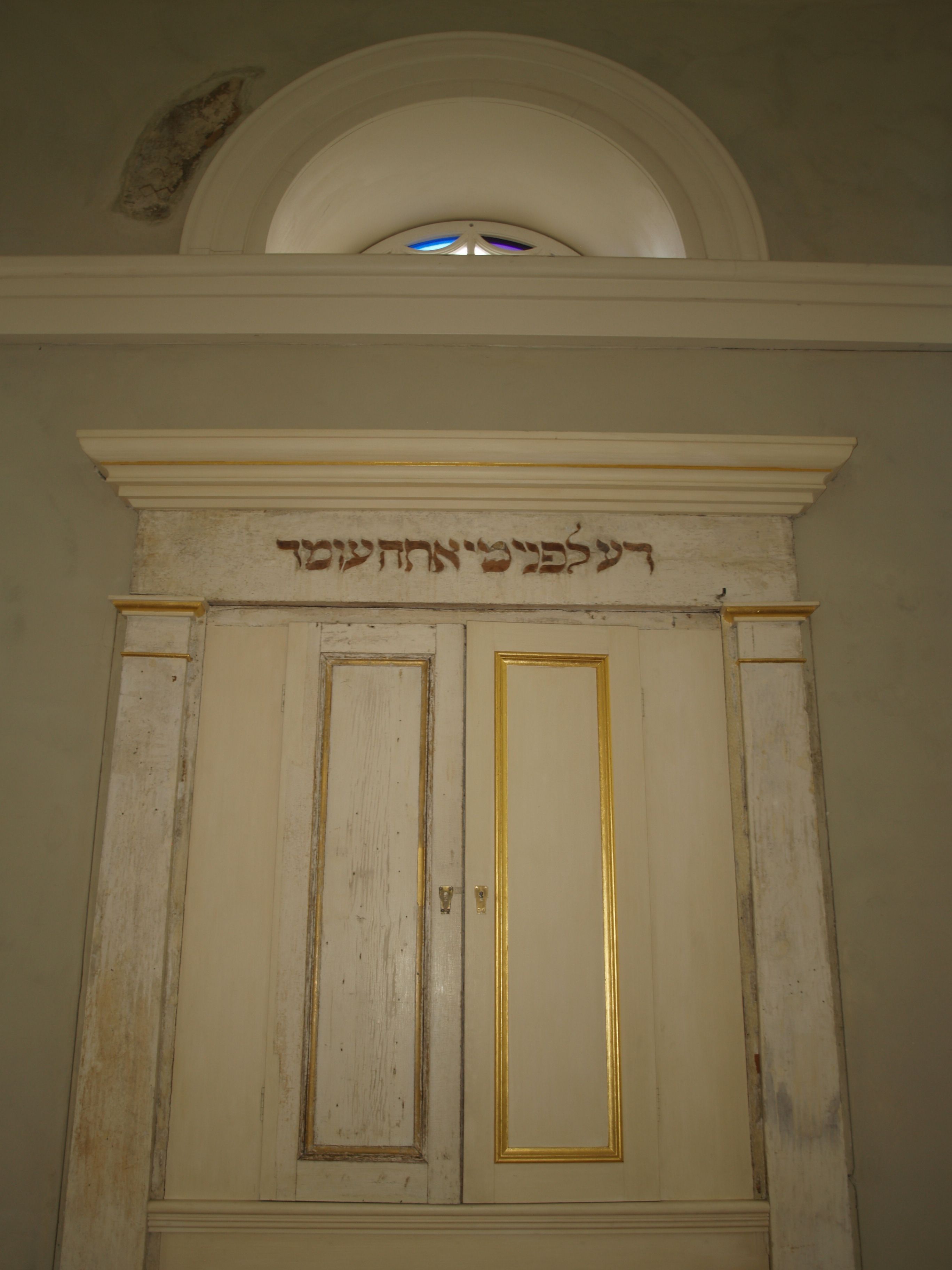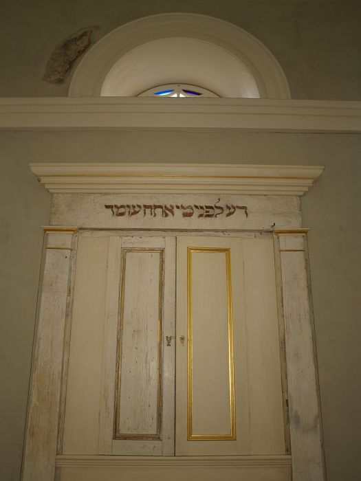 of the former Torah Ark. Only the light cornice is still recognizable on the