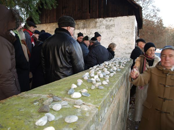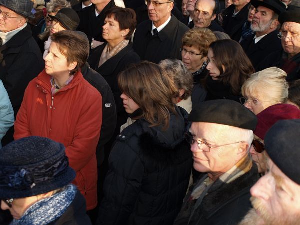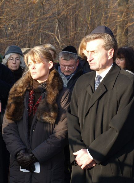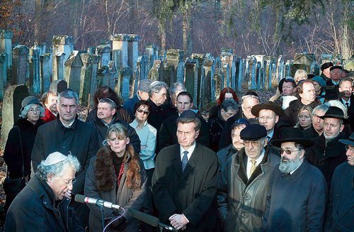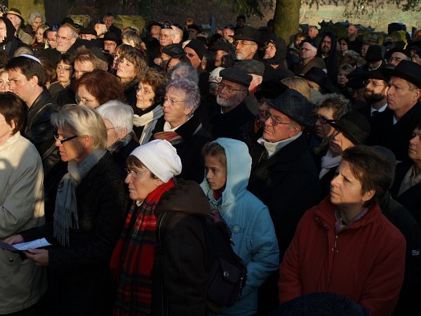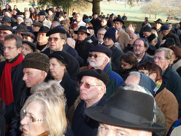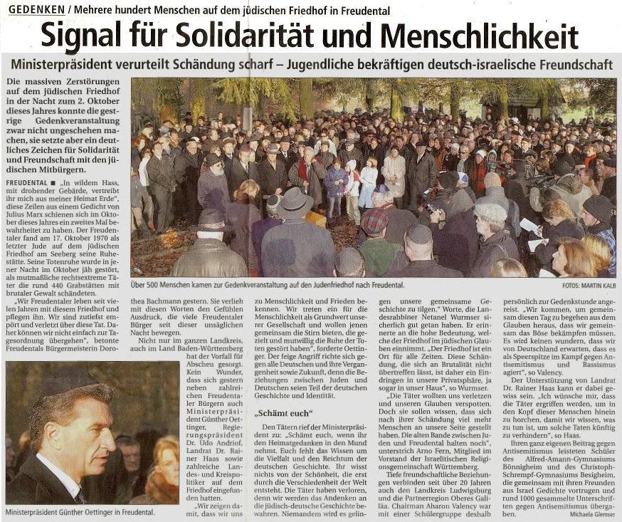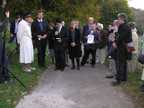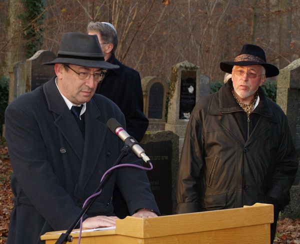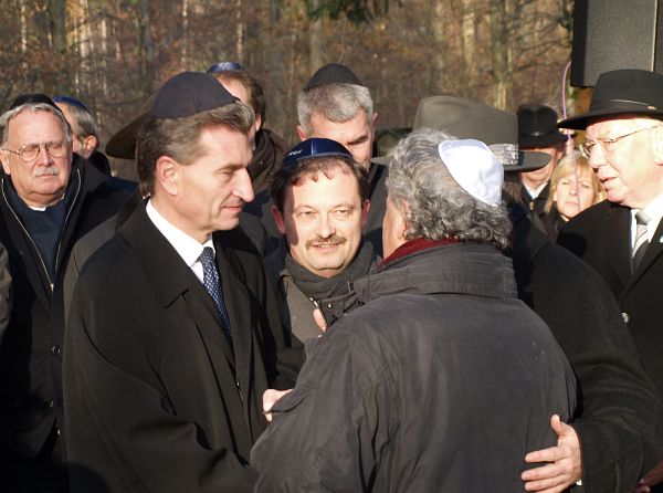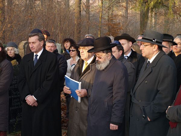 (Archivbild: Alfred Drossel): Rund 600 Menschen – darunter Ministerpräsident Oettinger (Mitte) – nahmen im Jahr 2007 nach der Schändung des jüdischen Friedhofs an einer Gedenkstunde teil. Immer noch sucht die Polizei nach den Tätern.