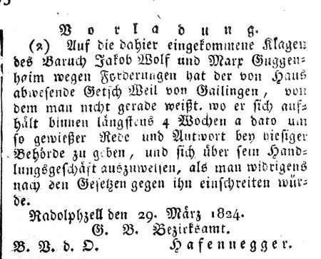 von Getsch Weil wegen Klagen des Baruch Jakob Wolf und Marx