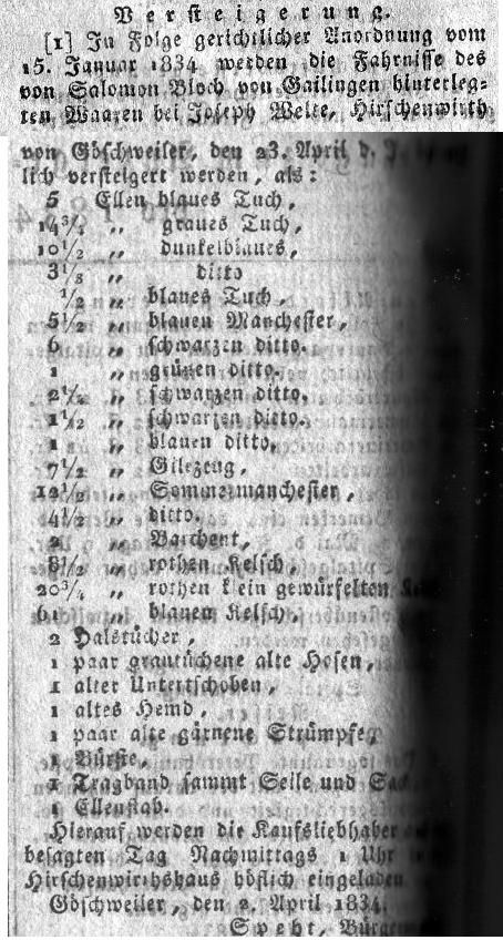 betreffs des verstorbenen Warenhändlers Moses Jung (1834)