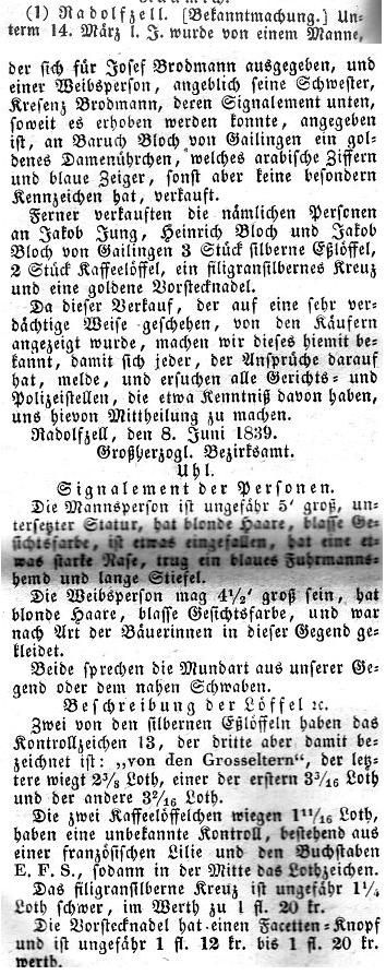 jüdischen Handelsleuten wurden Diebesgut verkauft (1839)