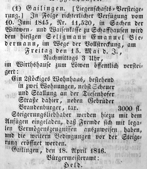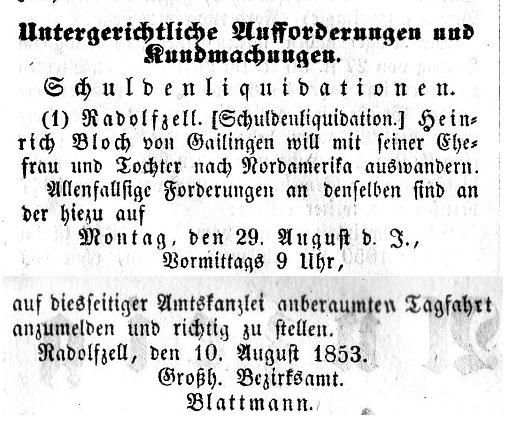 Lulaw) an den Vorsteher Bernheimer in Tiengen angekündigt: "Gailingen, den 7ten Septber 1851/