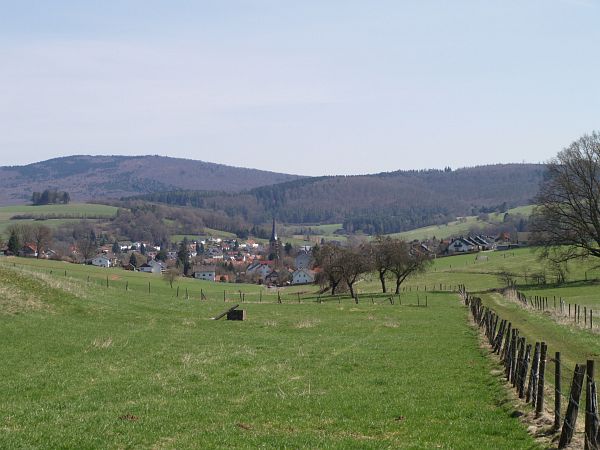 Der Blick nach Osten zeigt Gemünden mit seinem imposanten Kirchturm als
