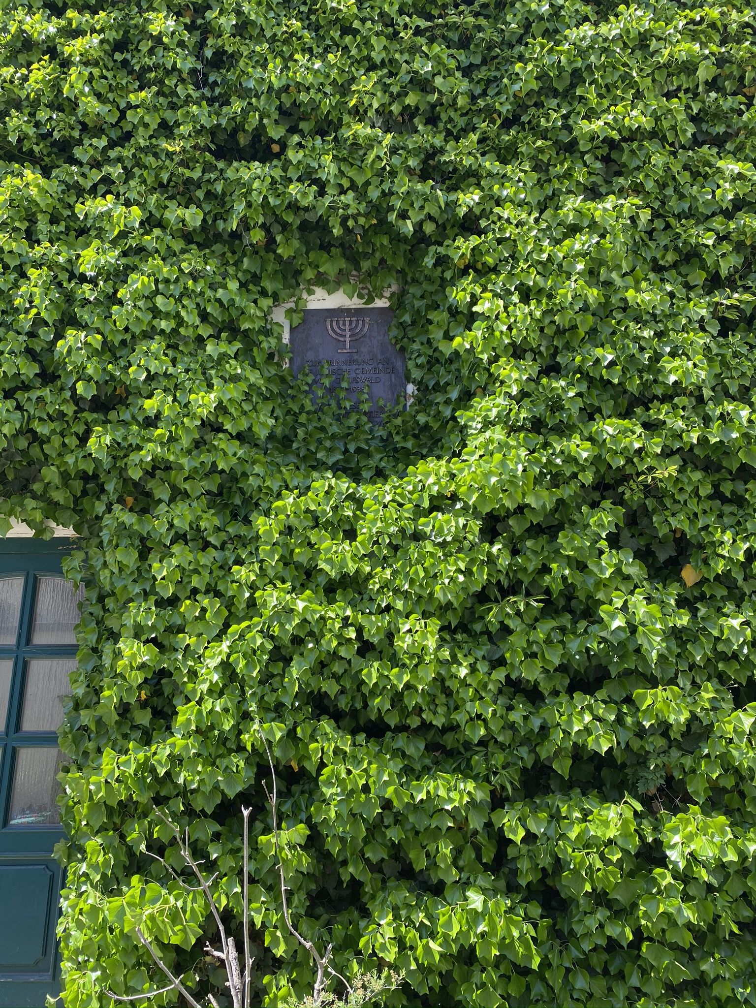 jüdischen Gemeinde befand mit einer (fast zugewachsenen) Hinweistafel; Text: