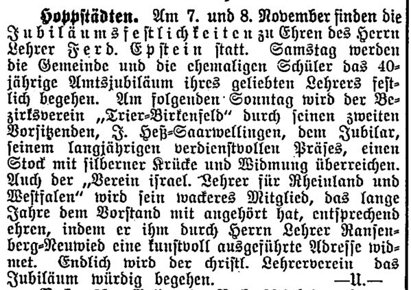 Jubiläumsfestlichkeiten zu Ehren des Herrn Lehrer Ferdinand Epstein statt.