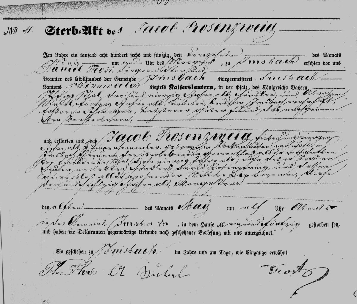 und erklärten uns, daß Jacob Rosenzweig, siebenundvierzig Jahre alt, Lumpensamler, geboren in Rockenhausen, wohnhaft in Imsbach, Ehemann der überlebenden gewerblos allda wohnhaften Eva Friedericka Thal, diese vierzig Jahre alt, Sohn des in Rockenhausen verlebten Händlers David