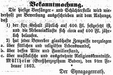 und Schochet tätig war. Zeitweise gab es in der 2. Hälfte des 19. Jahrhunderts neben dem jüdischen Lehrer zusätzlich einen Vorbeter und Schochet. Als erste Vorbeter werden seit Ende des 18.