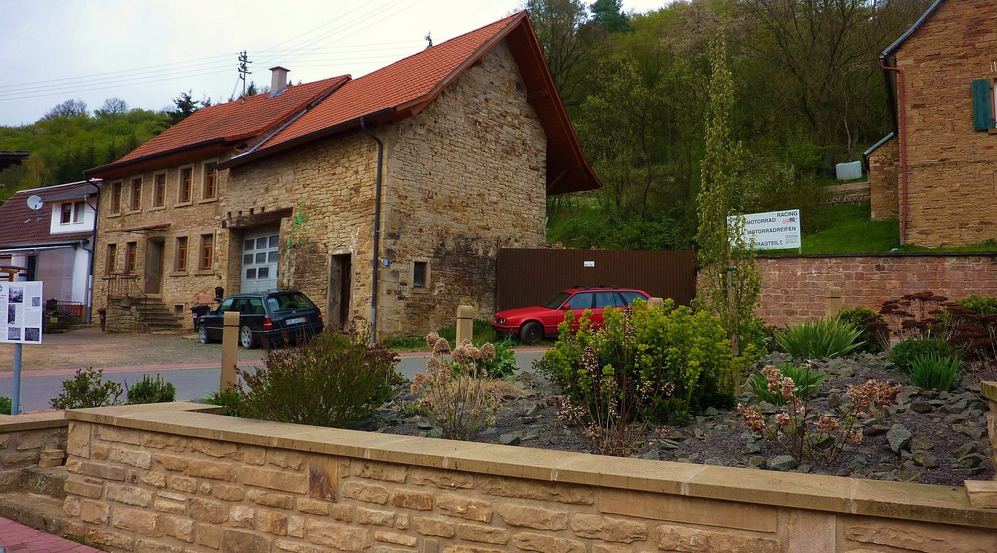 Bruchsteinbau mit ziegelgedecktem Satteldach. |