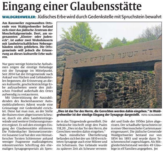 ehemaligen Synagoge in Waldgrehweiler hergestellt und im Mai 2019 am